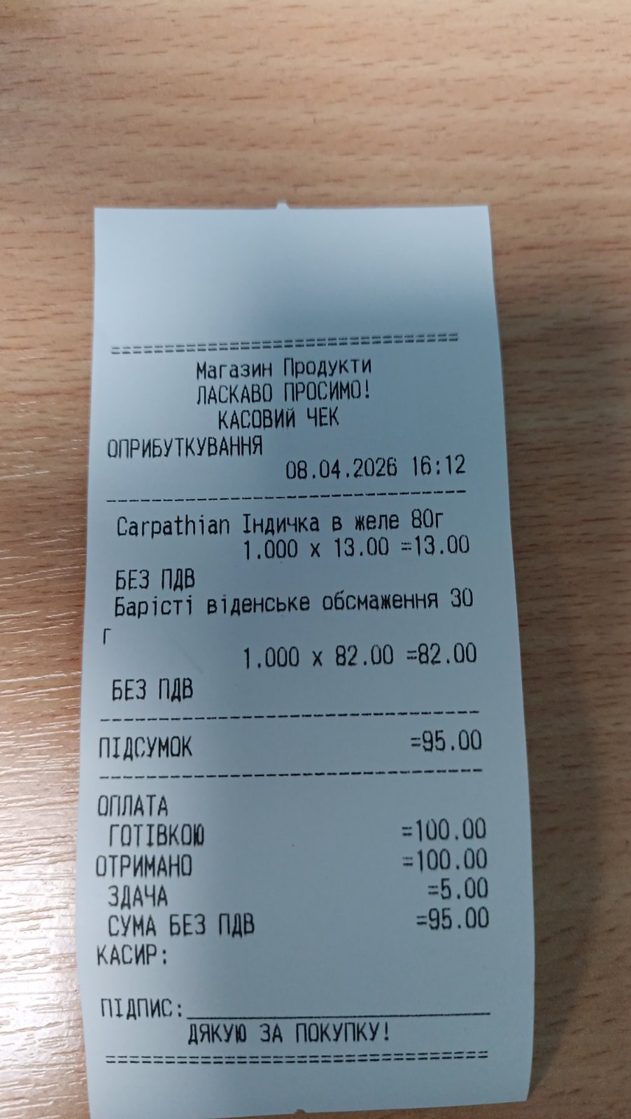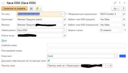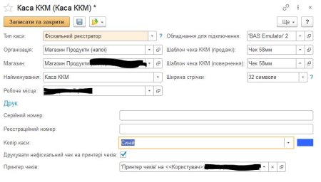 Коли каса працює через емулятор фіскального реєстратора (без реального ПРРО), чек все одно друкується на фізичному принтері чеків робочого місця. Текст чека формується за шаблоном, вказаним у налаштуваннях каси ККМ, з правильною шириною стрічки. Касир пробиває чек як завжди — друк на принтер чеків відбувається автоматично