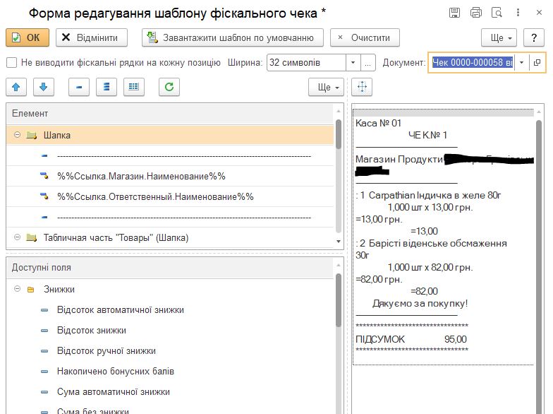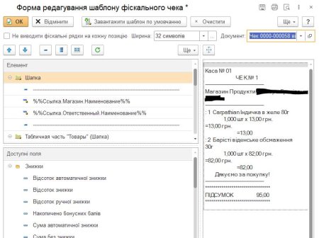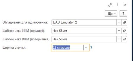 Чек формується не за внутрішнім форматом емулятора, а за шаблоном, вказаним у картці каси ККМ (поле «Шаблон чека ККМ»). Підтримується ширина стрічки принтера — текст автоматично форматується під 32, 36 або 48 символів.