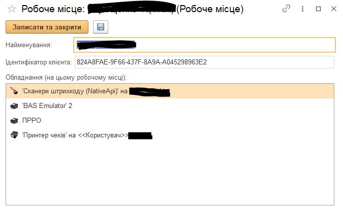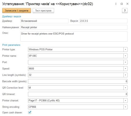 У формі «Підключення та настройка обладнання» додайте принтер чеків для робочого місця касира. Підтримуються принтери з ESC/POS протоколом (XP-58C, XP-80C, Rongta тощо).