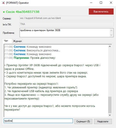 - Режим з оператором. IT-спеціаліст супроводжує сесію: отримує попередній діагноз від Claude, підтверджує виконання скриптів, контролює хід роботи.